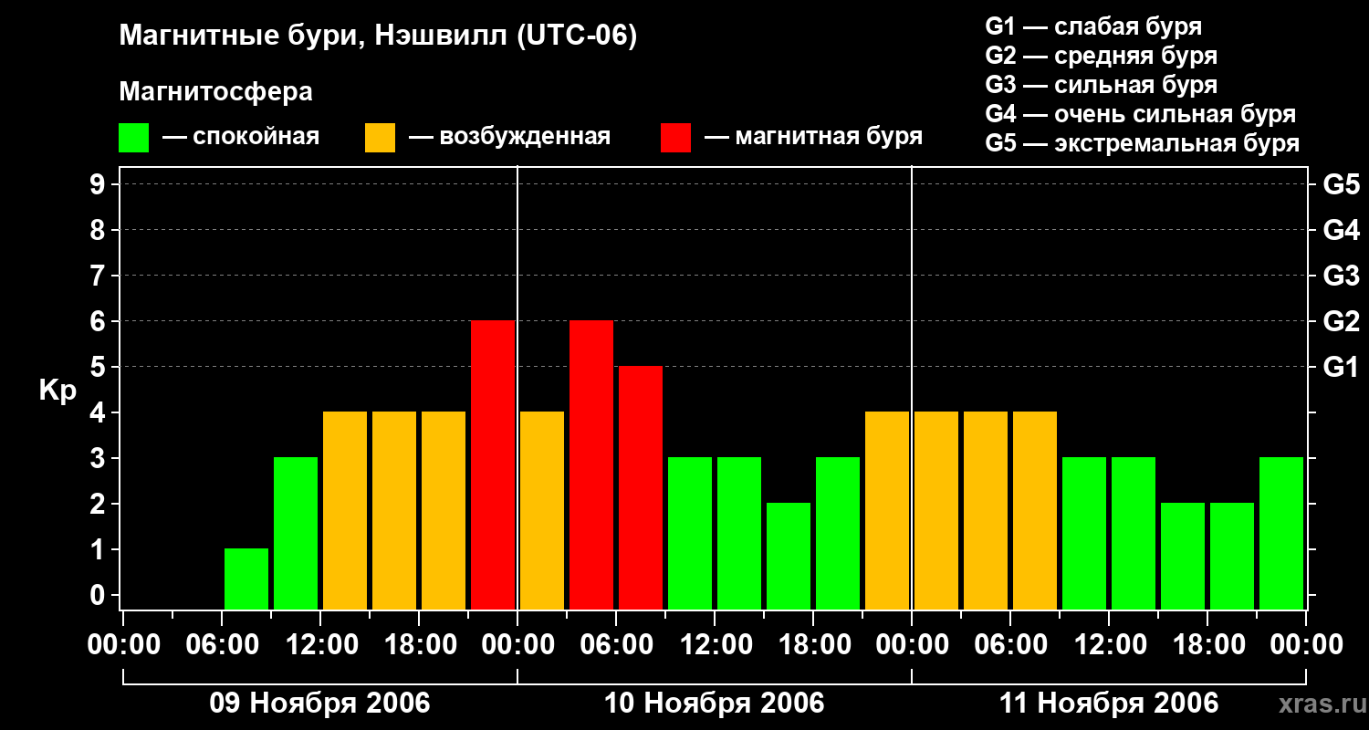 Изменения геомагнитного индекса Kp с 9 по 11 ноября 2006 года для средних широт