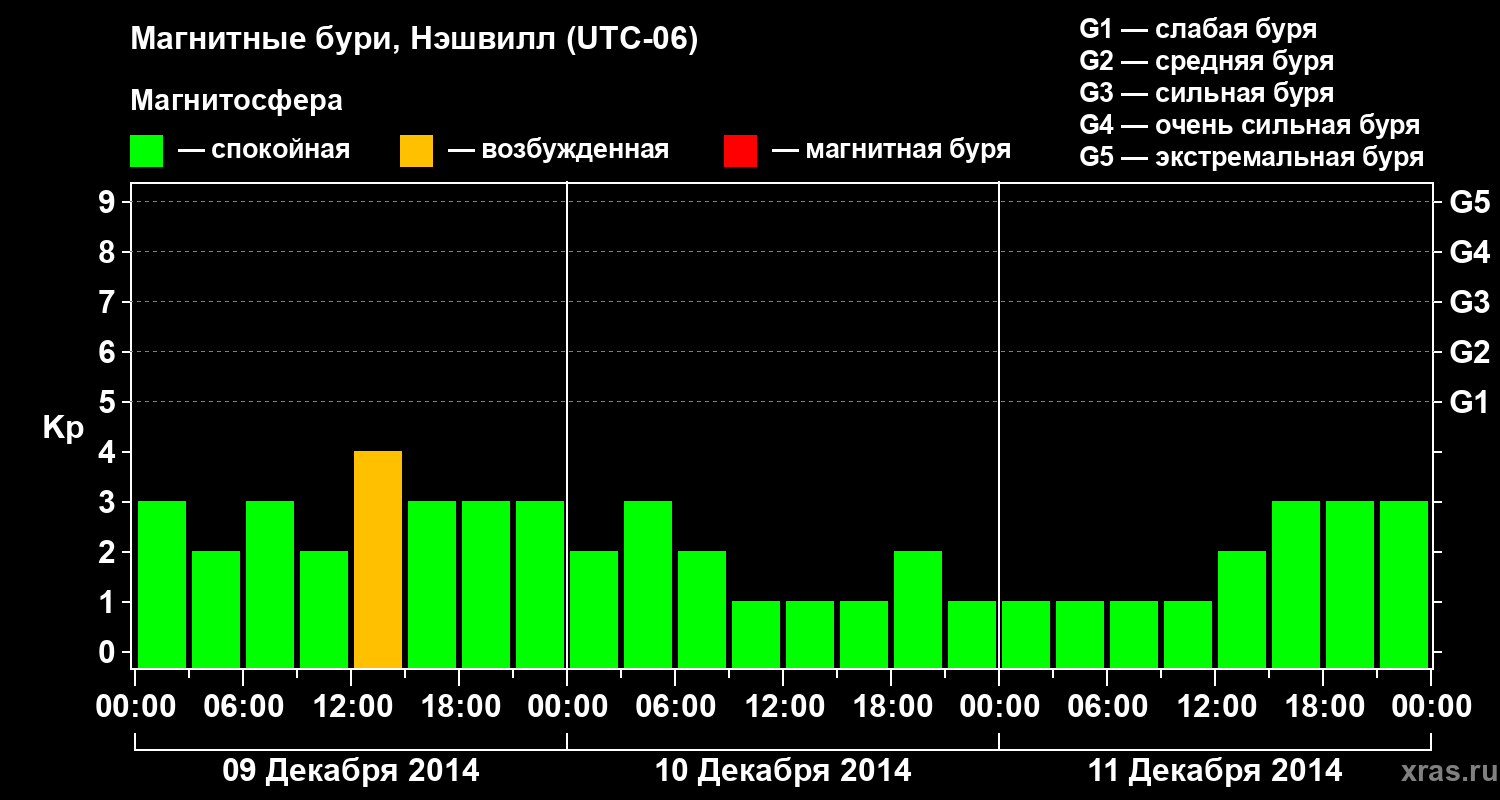 Изменения геомагнитного индекса Kp с 9 по 11 декабря 2014 года для средних широт