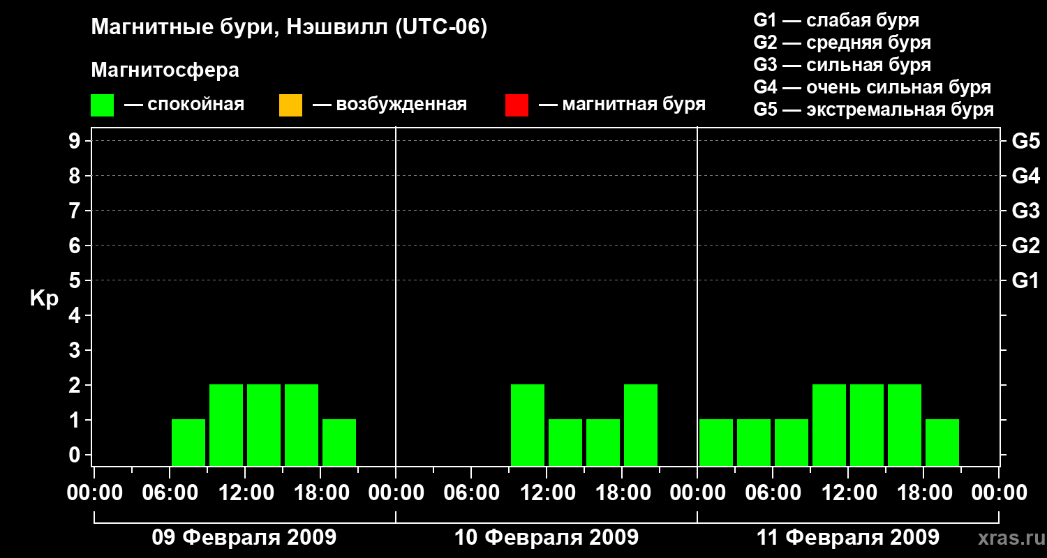 Изменения геомагнитного индекса Kp с 9 по 11 февраля 2009 года для средних широт