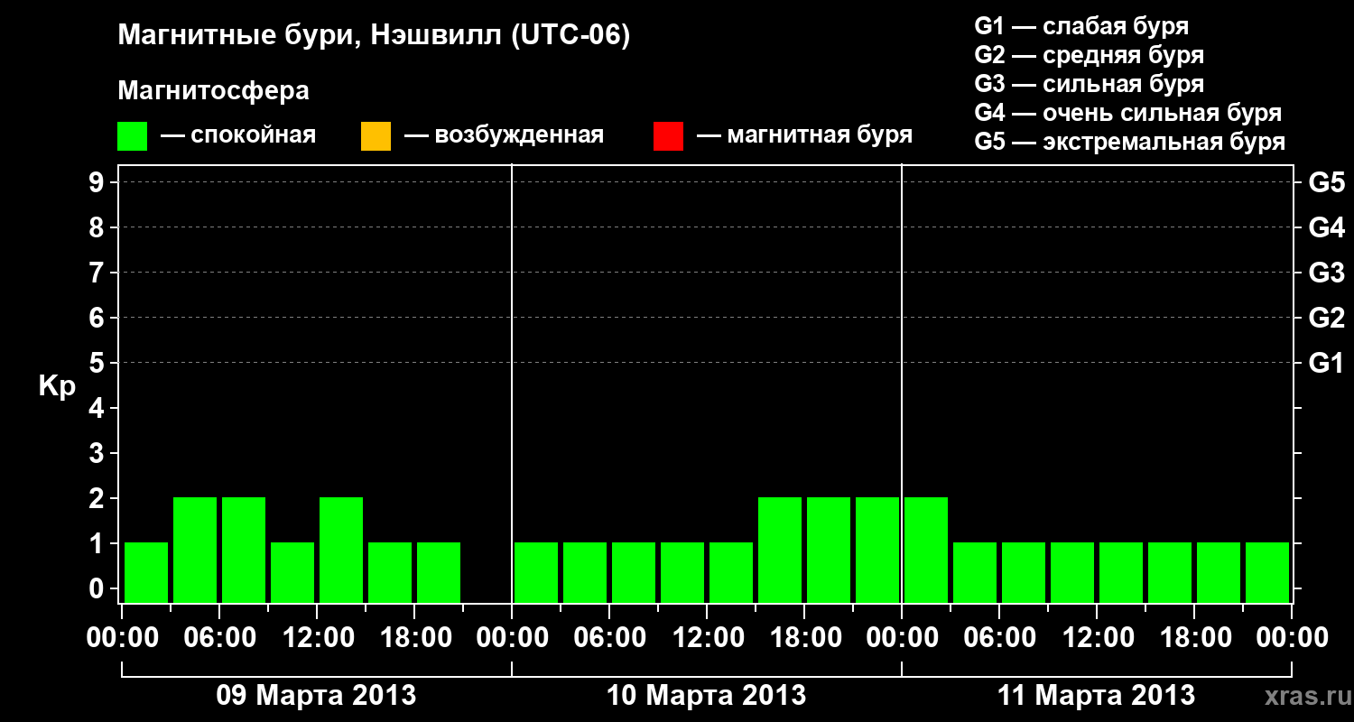 Изменения геомагнитного индекса Kp с 9 по 11 марта 2013 года для средних широт