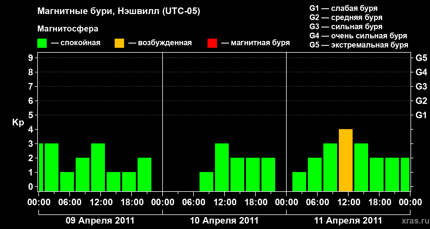 Изменения геомагнитного индекса Kp с 9 по 11 апреля 2011 года для средних широт