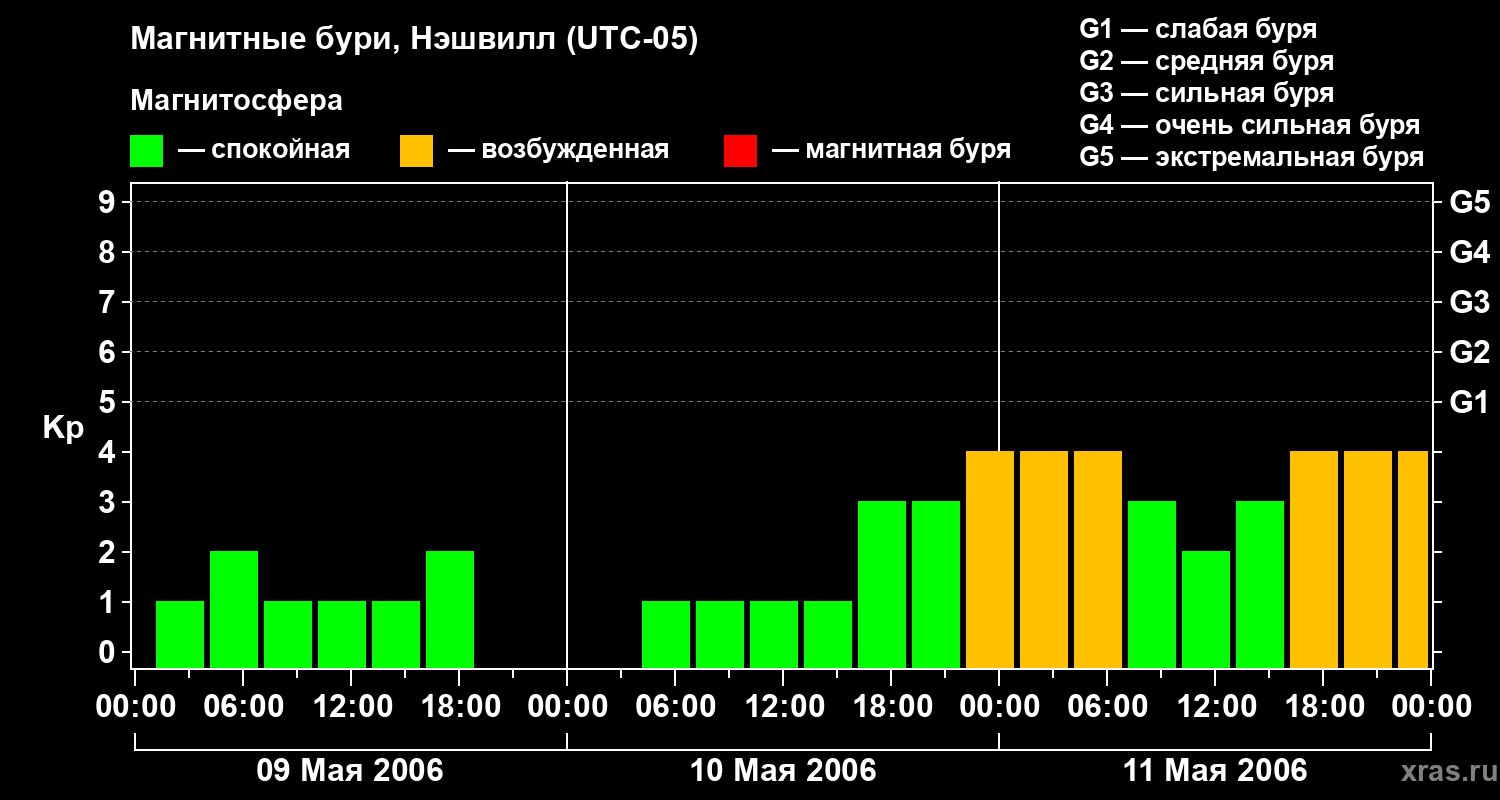 Изменения геомагнитного индекса Kp с 9 по 11 мая 2006 года для средних широт