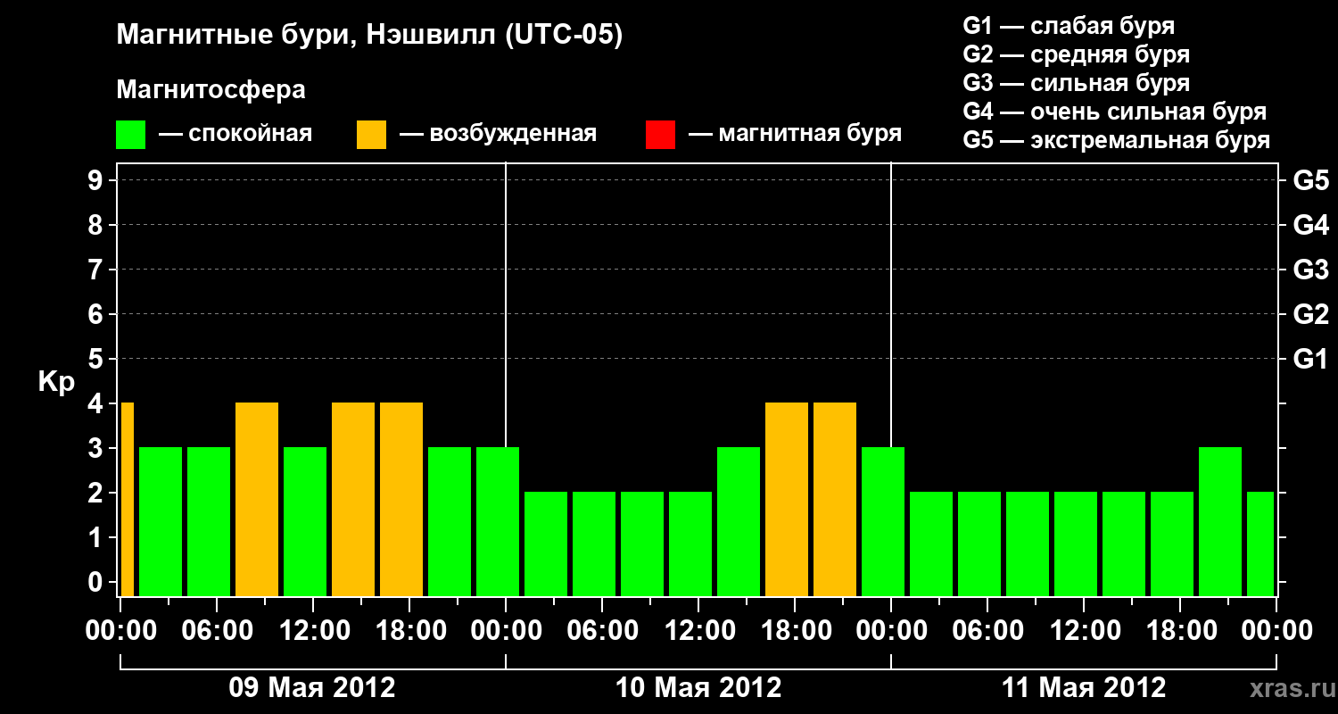 Изменения геомагнитного индекса Kp с 9 по 11 мая 2012 года для средних широт