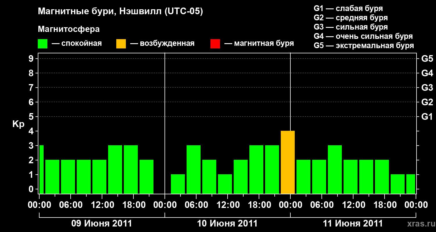 Изменения геомагнитного индекса Kp с 9 по 11 июня 2011 года для средних широт