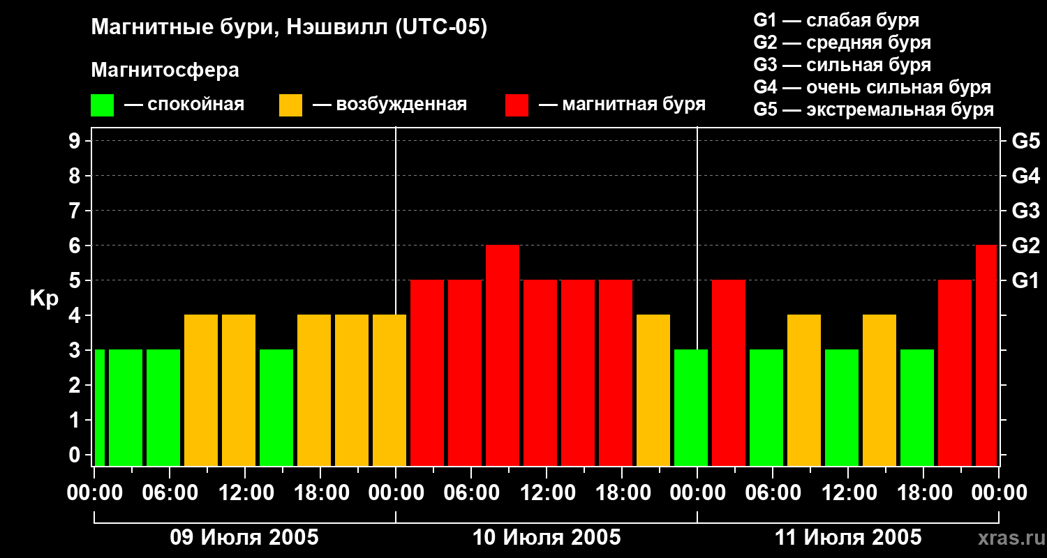Изменения геомагнитного индекса Kp с 9 по 11 июля 2005 года для средних широт