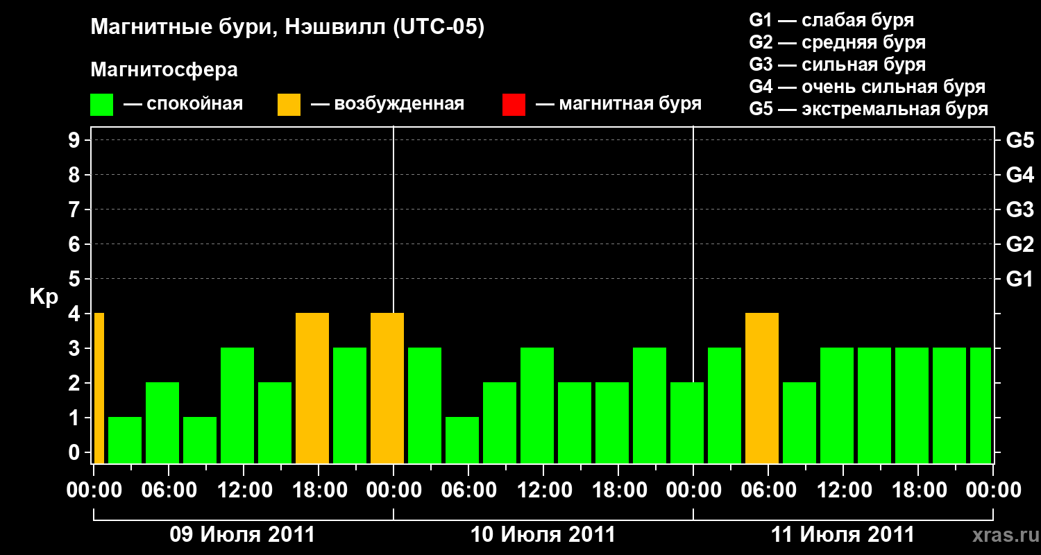Изменения геомагнитного индекса Kp с 9 по 11 июля 2011 года для средних широт