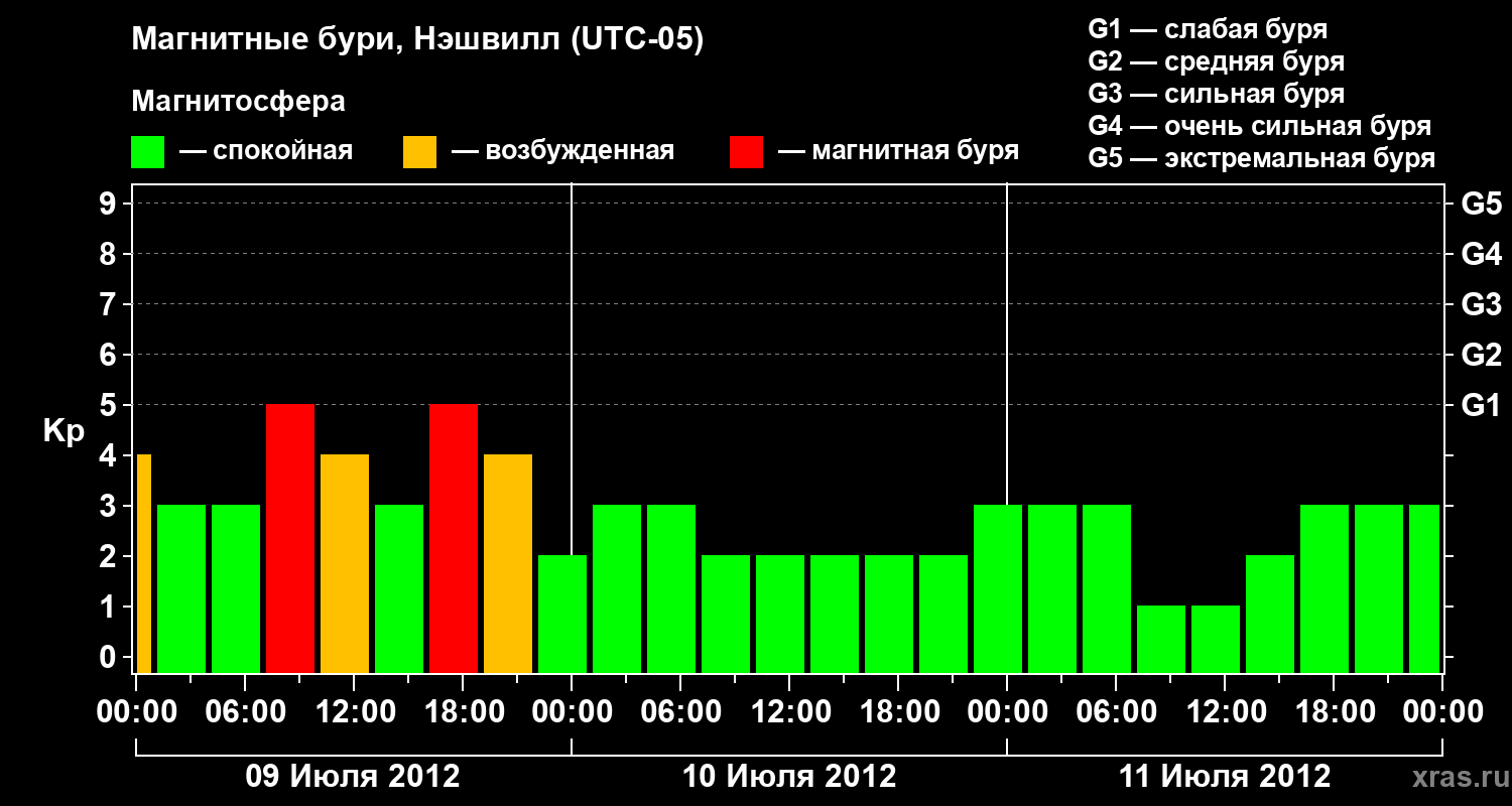 Изменения геомагнитного индекса Kp с 9 по 11 июля 2012 года для средних широт