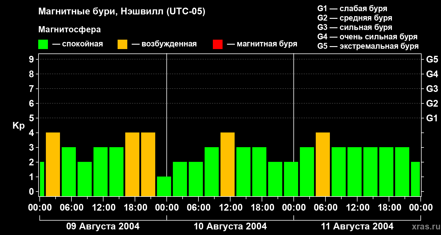 Изменения геомагнитного индекса Kp с 9 по 11 августа 2004 года для средних широт