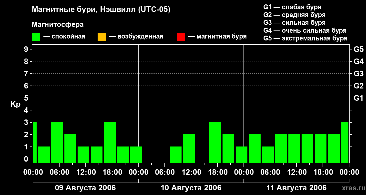 Изменения геомагнитного индекса Kp с 9 по 11 августа 2006 года для средних широт