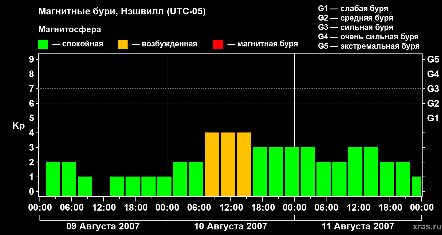 Изменения геомагнитного индекса Kp с 9 по 11 августа 2007 года для средних широт