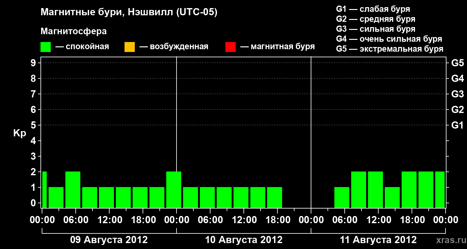 Изменения геомагнитного индекса Kp с 9 по 11 августа 2012 года для средних широт