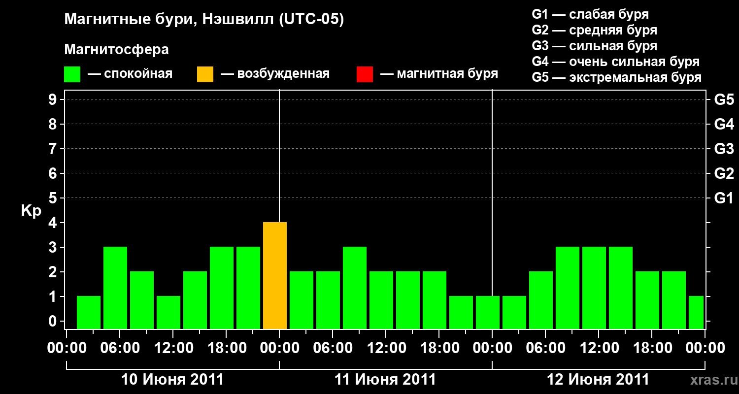 Изменения геомагнитного индекса Kp с 10 по 12 июня 2011 года для средних широт