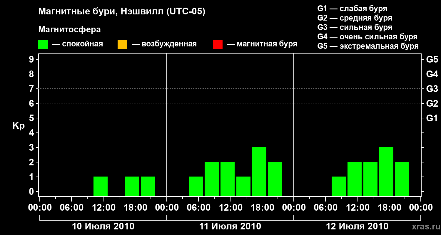 Изменения геомагнитного индекса Kp с 10 по 12 июля 2010 года для средних широт