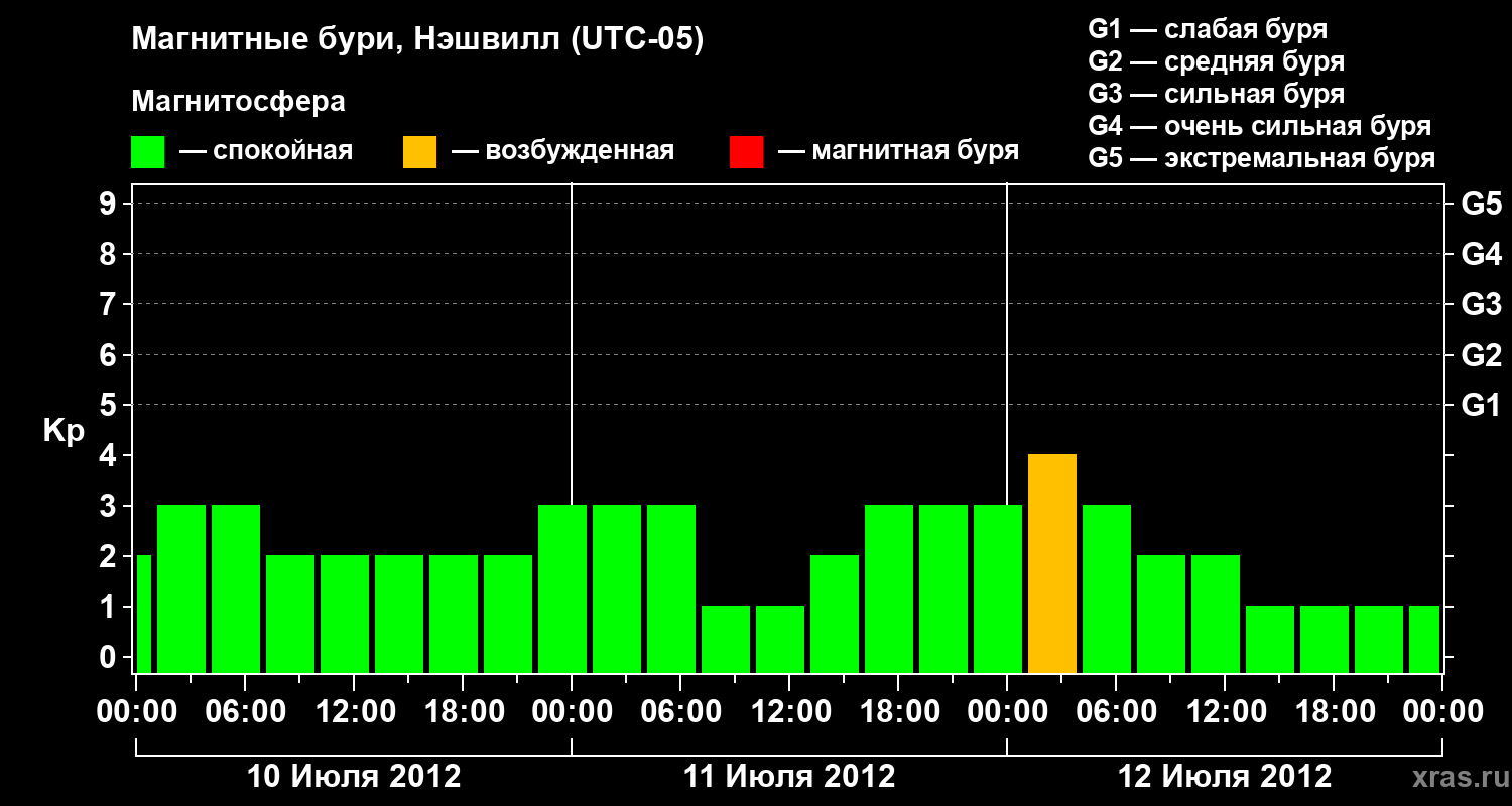 Изменения геомагнитного индекса Kp с 10 по 12 июля 2012 года для средних широт