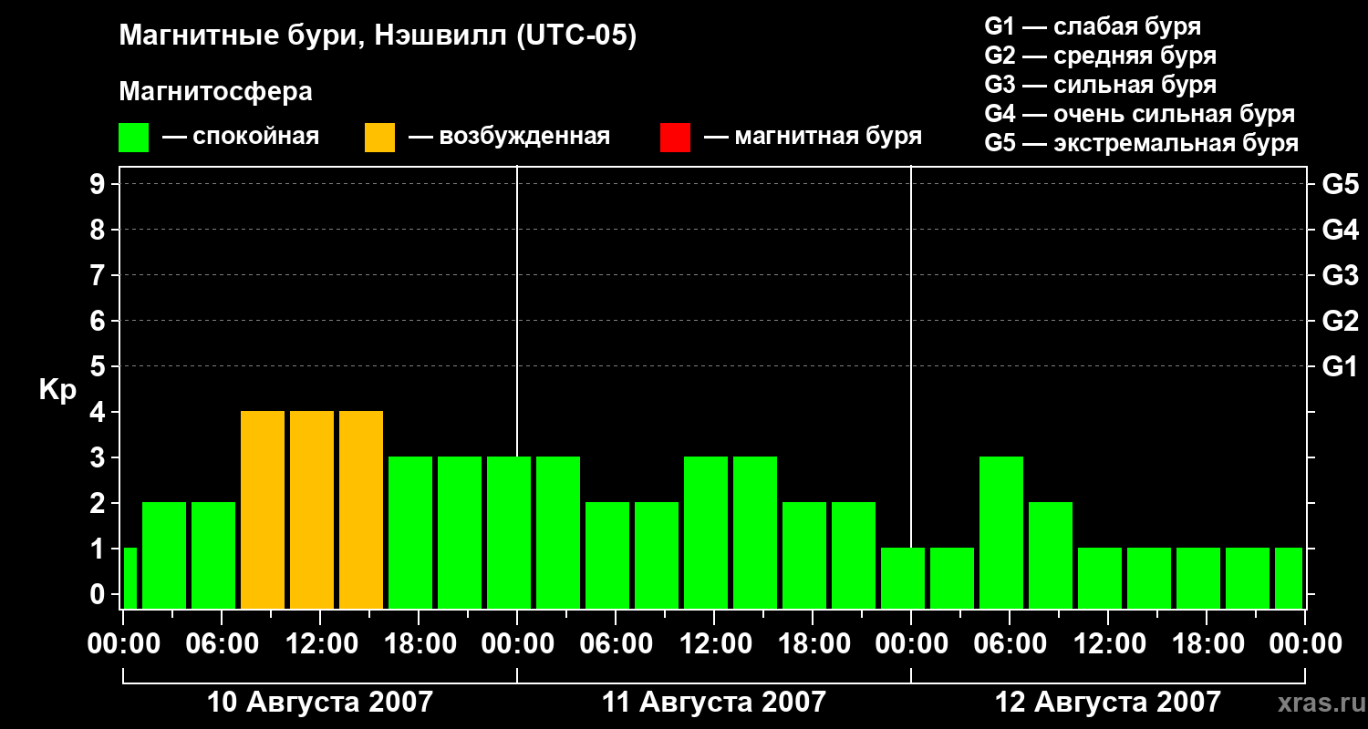 Изменения геомагнитного индекса Kp с 10 по 12 августа 2007 года для средних широт