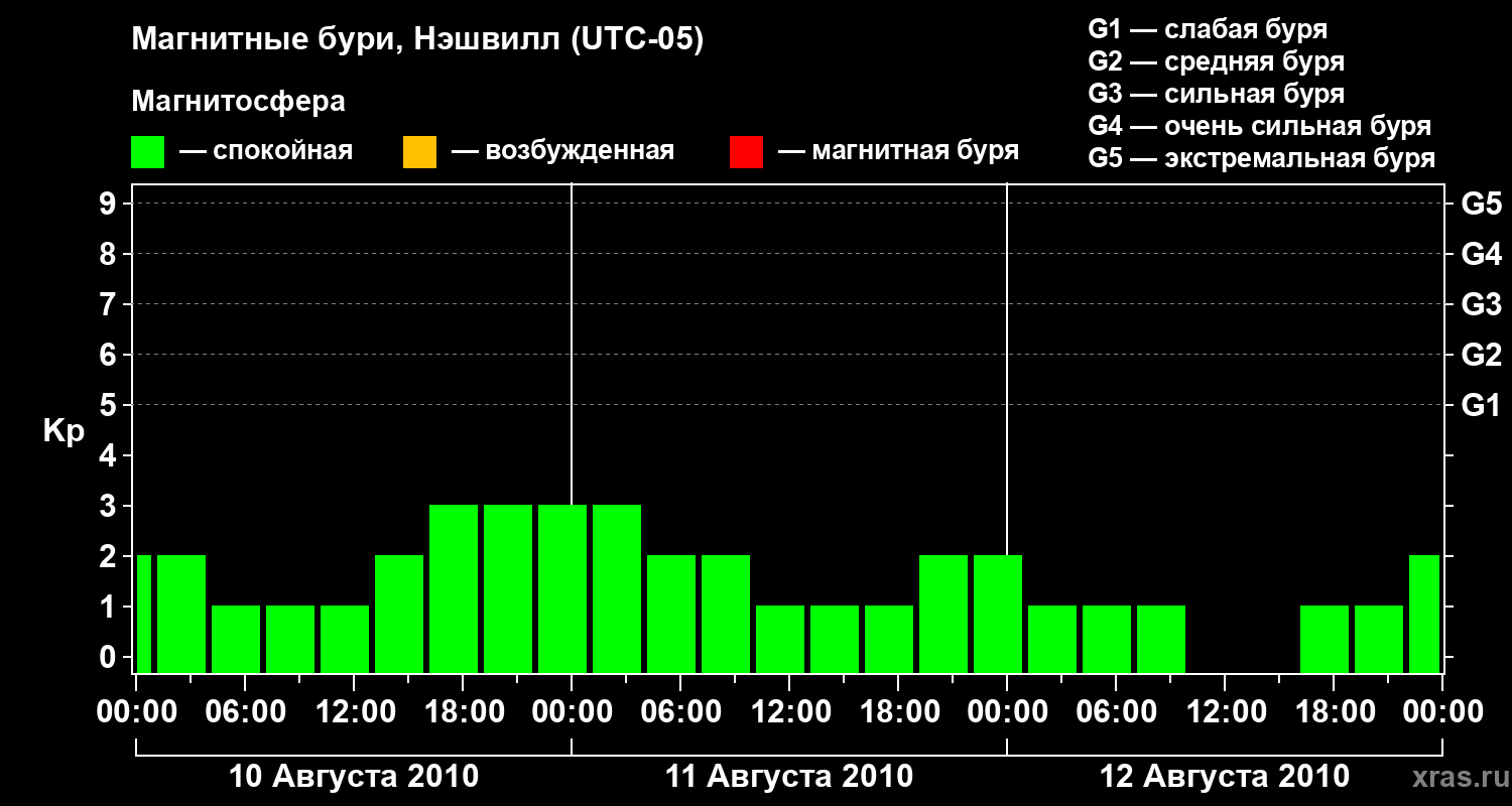 Изменения геомагнитного индекса Kp с 10 по 12 августа 2010 года для средних широт