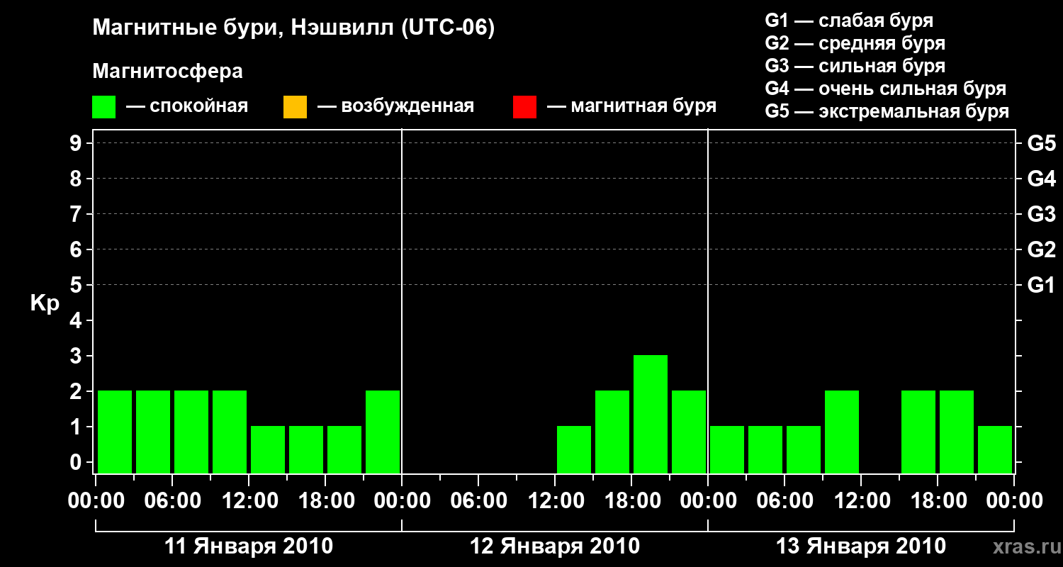 Изменения геомагнитного индекса Kp с 11 по 13 января 2010 года для средних широт
