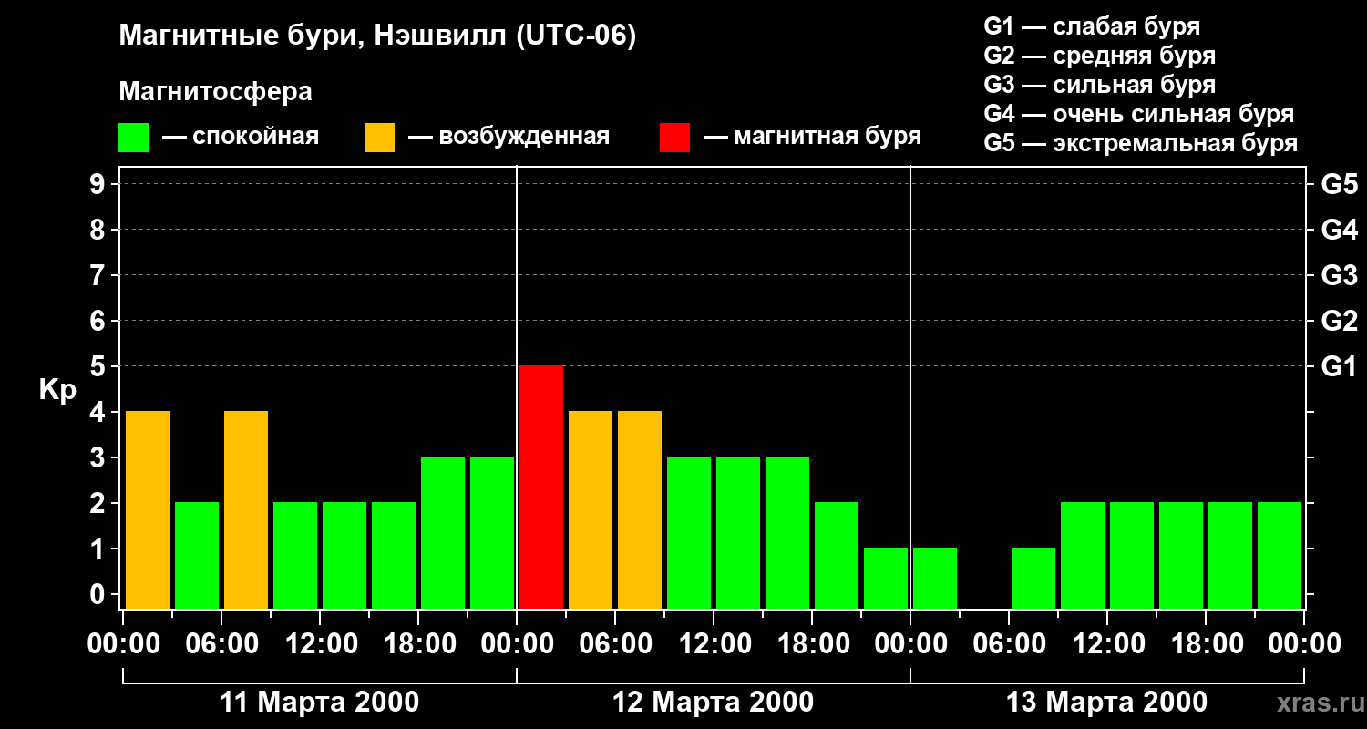 Изменения геомагнитного индекса Kp с 11 по 13 марта 2000 года для средних широт