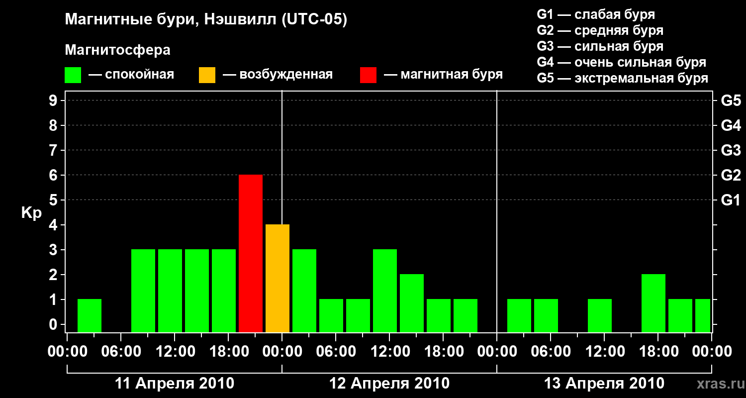 Изменения геомагнитного индекса Kp с 11 по 13 апреля 2010 года для средних широт