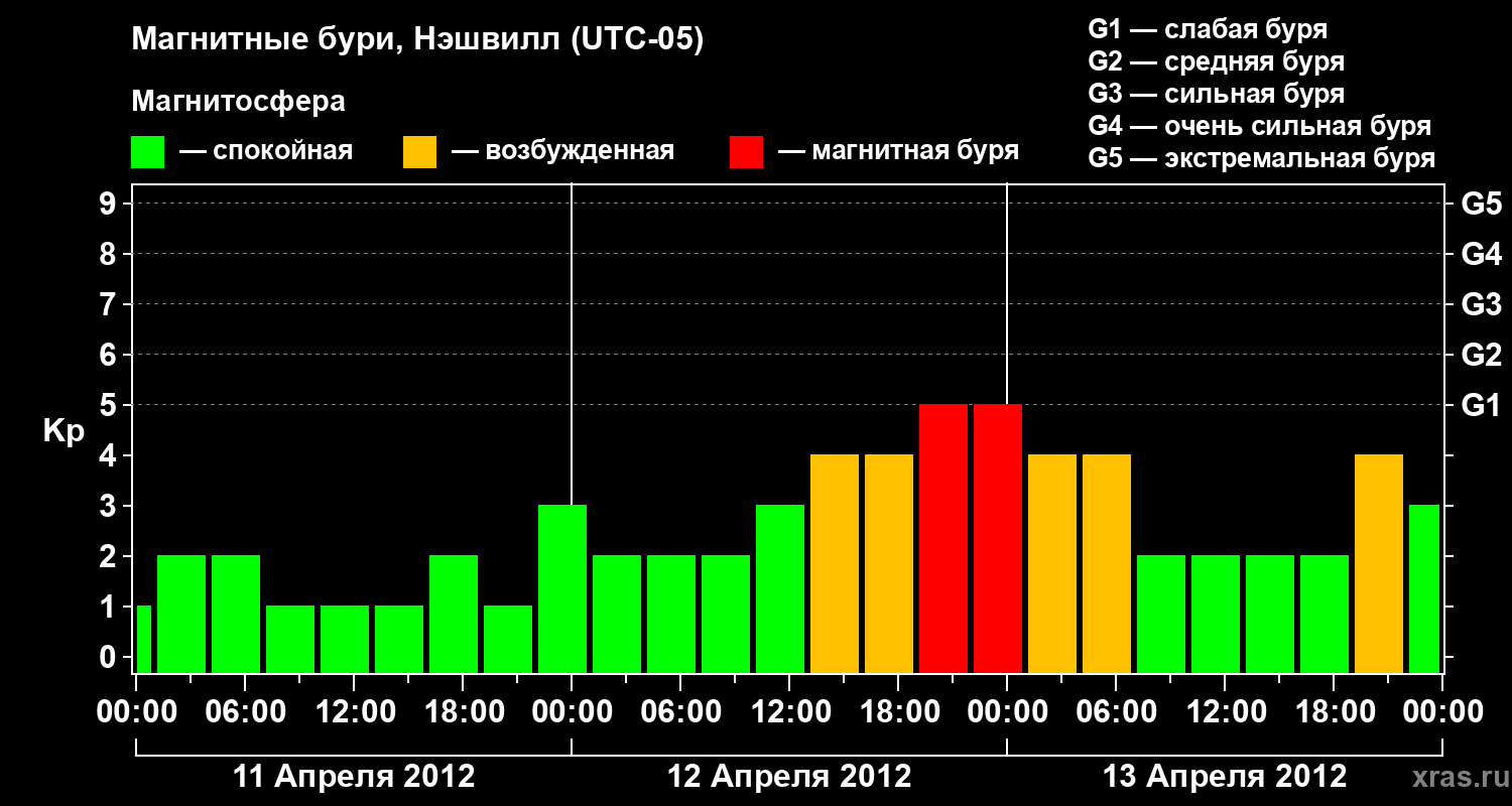 Изменения геомагнитного индекса Kp с 11 по 13 апреля 2012 года для средних широт