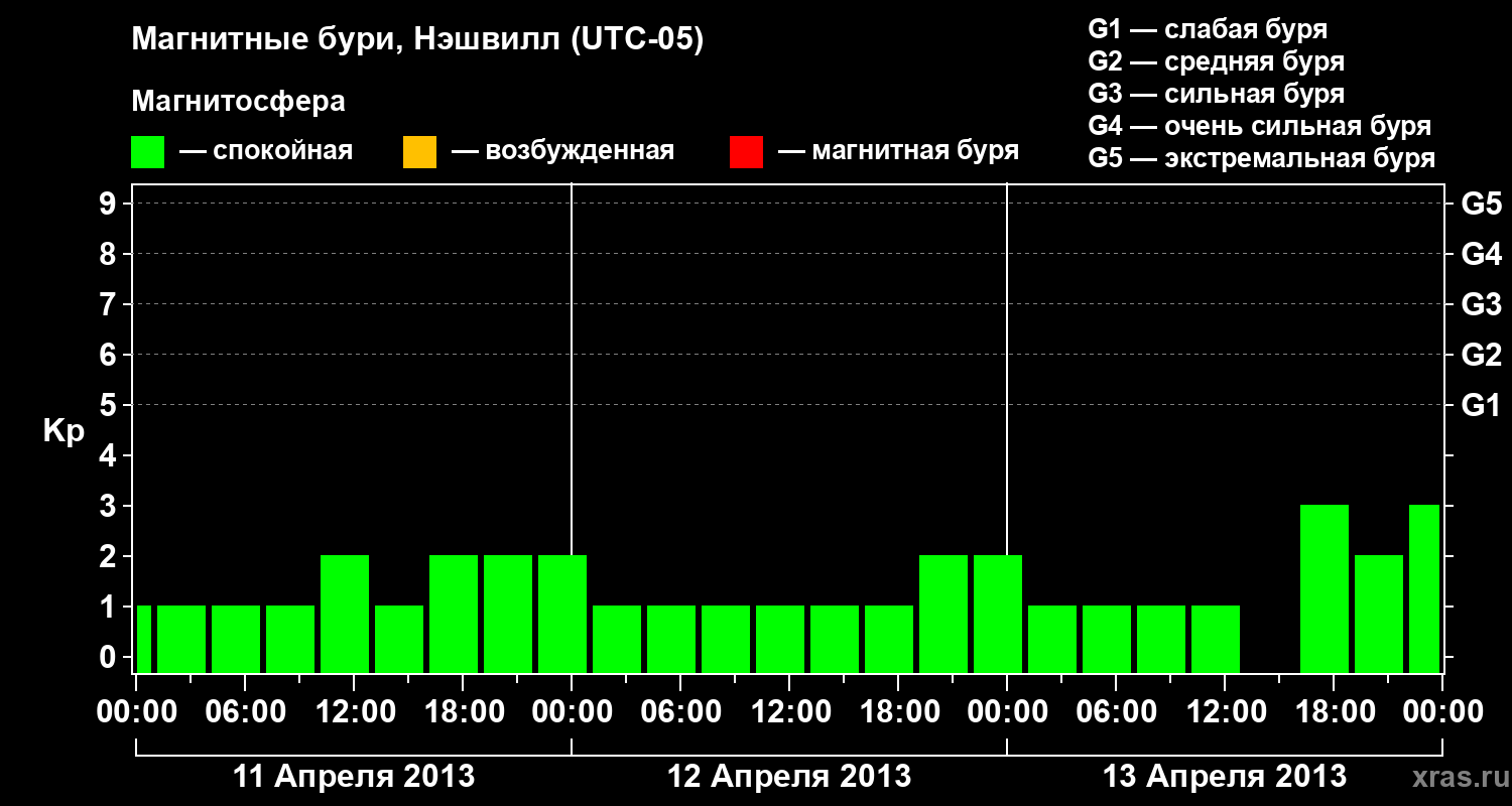 Изменения геомагнитного индекса Kp с 11 по 13 апреля 2013 года для средних широт