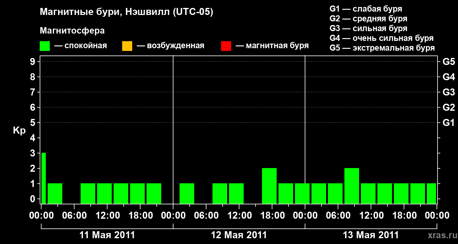 Изменения геомагнитного индекса Kp с 11 по 13 мая 2011 года для средних широт