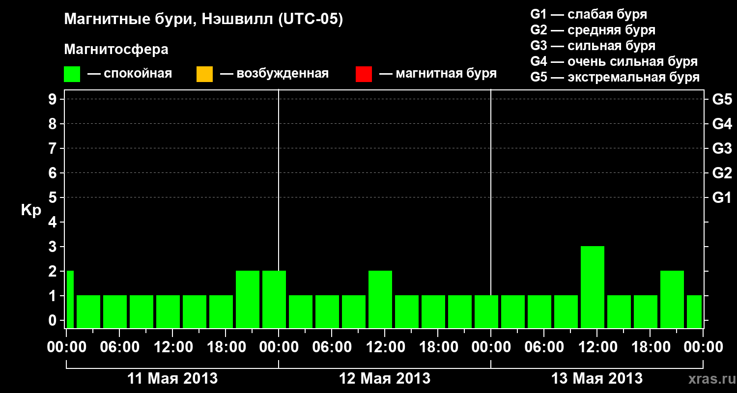 Изменения геомагнитного индекса Kp с 11 по 13 мая 2013 года для средних широт