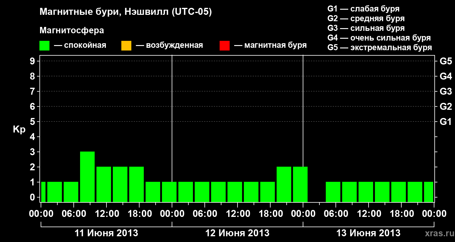 Изменения геомагнитного индекса Kp с 11 по 13 июня 2013 года для средних широт
