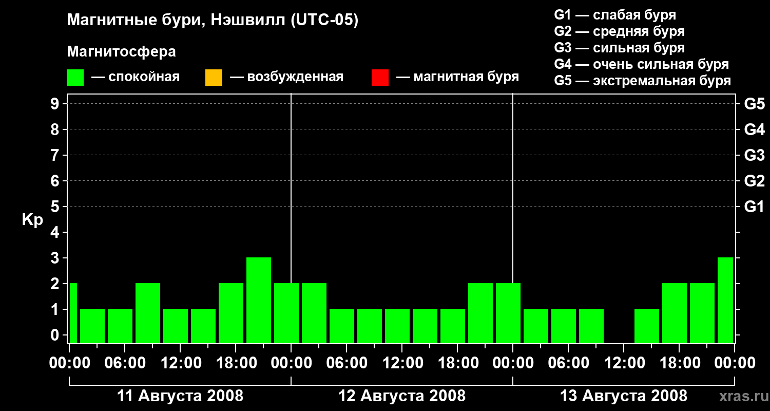 Изменения геомагнитного индекса Kp с 11 по 13 августа 2008 года для средних широт