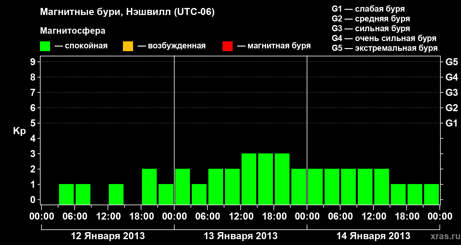 Изменения геомагнитного индекса Kp с 12 по 14 января 2013 года для средних широт