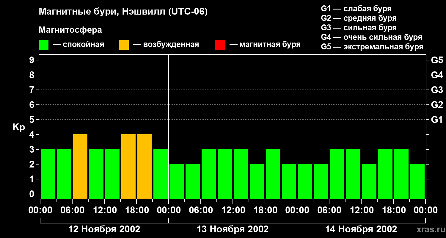 Изменения геомагнитного индекса Kp с 12 по 14 ноября 2002 года для средних широт