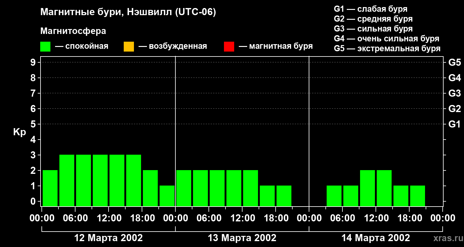 Изменения геомагнитного индекса Kp с 12 по 14 марта 2002 года для средних широт