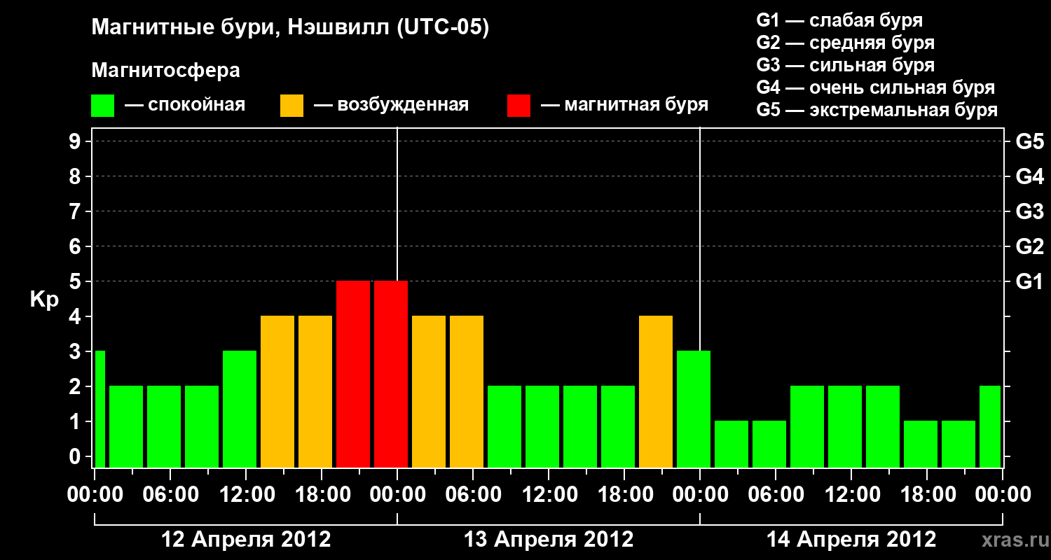 Изменения геомагнитного индекса Kp с 12 по 14 апреля 2012 года для средних широт
