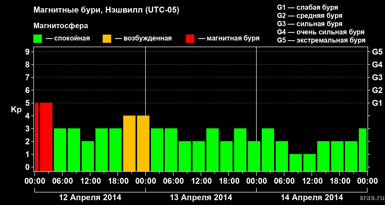 Изменения геомагнитного индекса Kp с 12 по 14 апреля 2014 года для средних широт