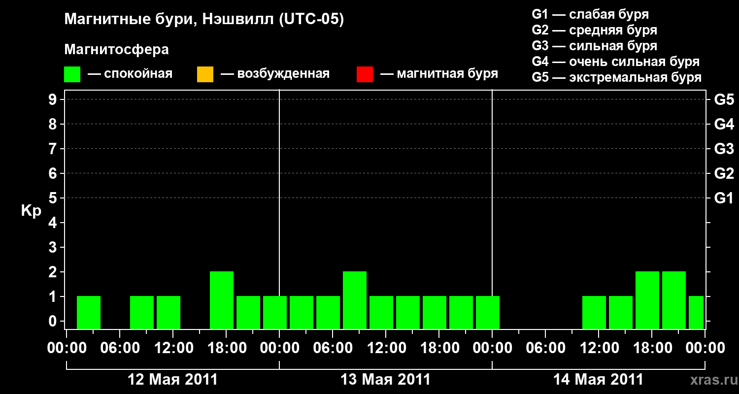 Изменения геомагнитного индекса Kp с 12 по 14 мая 2011 года для средних широт