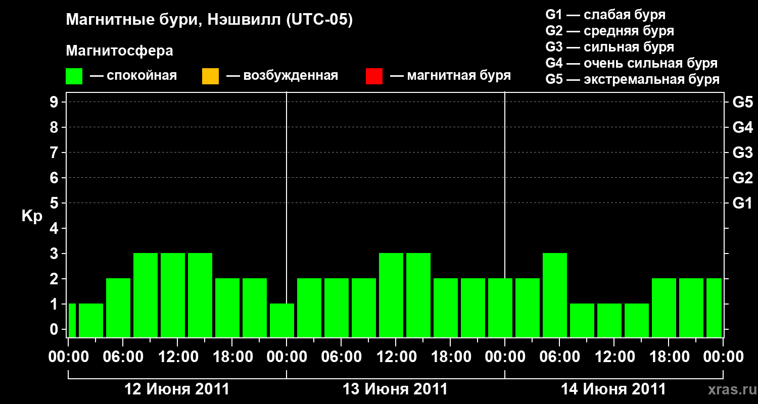 Изменения геомагнитного индекса Kp с 12 по 14 июня 2011 года для средних широт