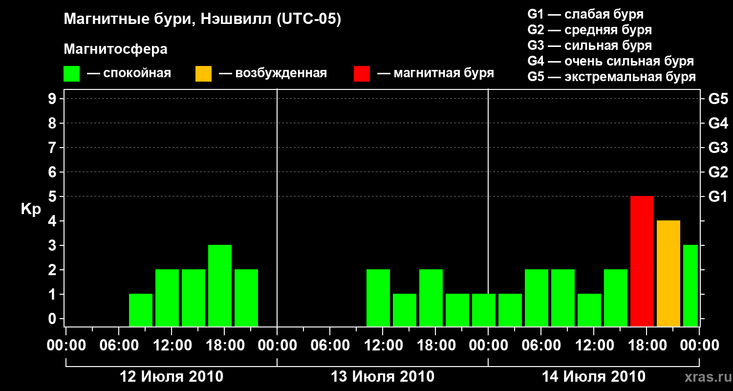 Изменения геомагнитного индекса Kp с 12 по 14 июля 2010 года для средних широт