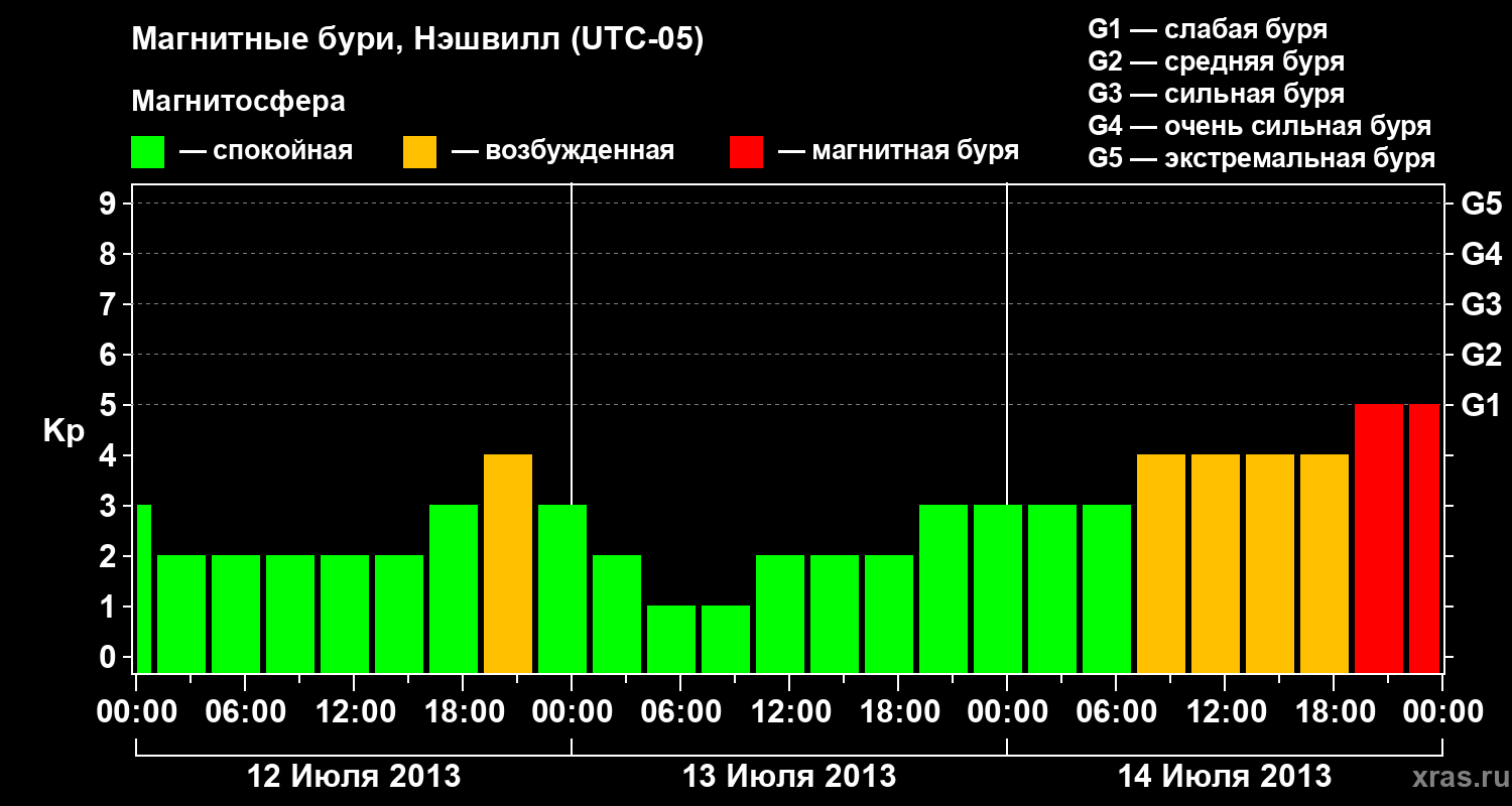 Изменения геомагнитного индекса Kp с 12 по 14 июля 2013 года для средних широт