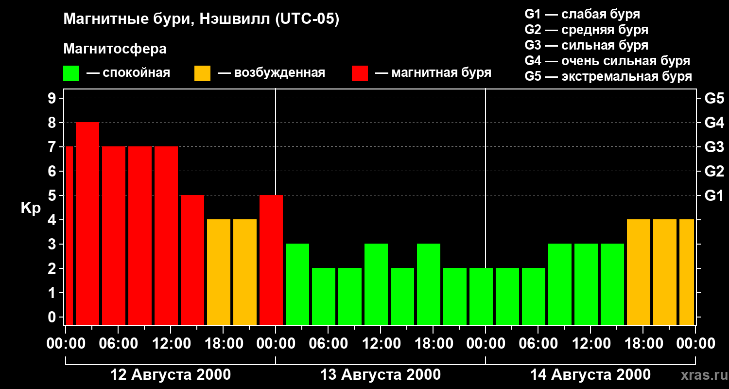 Изменения геомагнитного индекса Kp с 12 по 14 августа 2000 года для средних широт