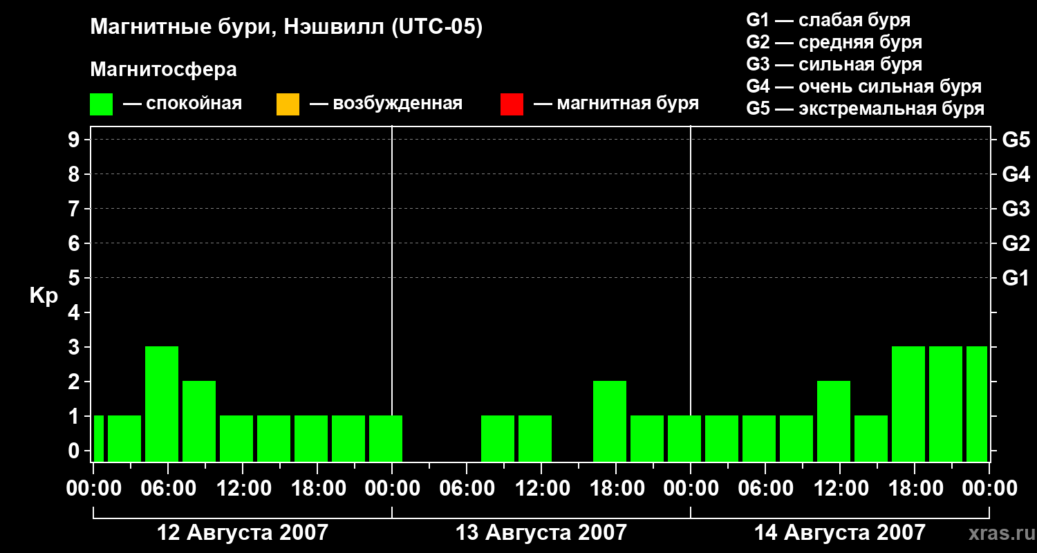 Изменения геомагнитного индекса Kp с 12 по 14 августа 2007 года для средних широт