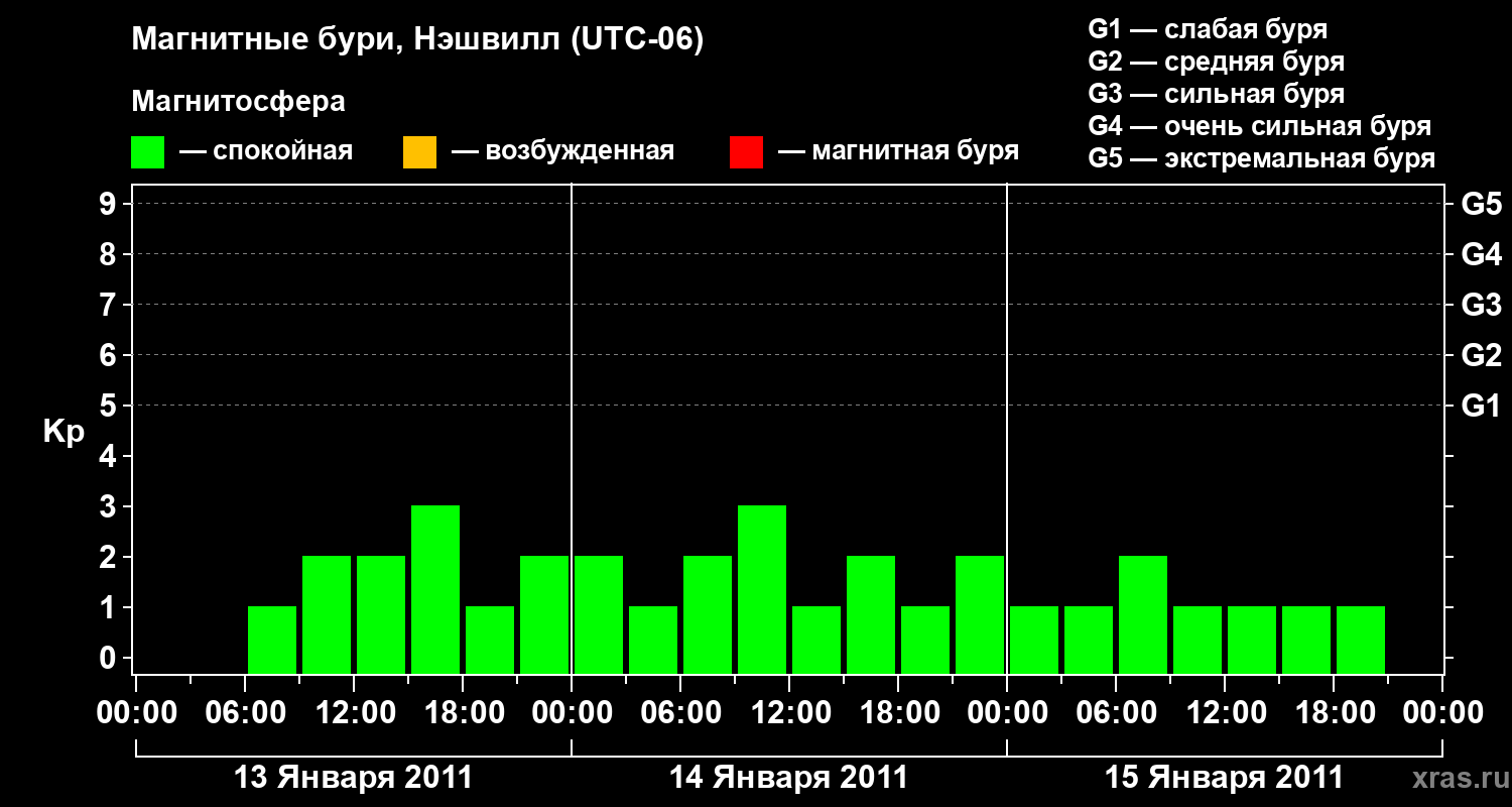 Изменения геомагнитного индекса Kp с 13 по 15 января 2011 года для средних широт