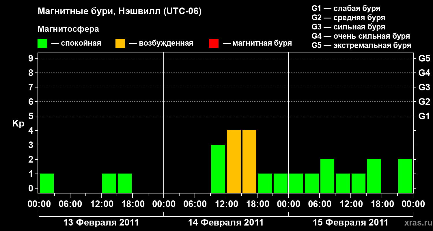 Изменения геомагнитного индекса Kp с 13 по 15 февраля 2011 года для средних широт