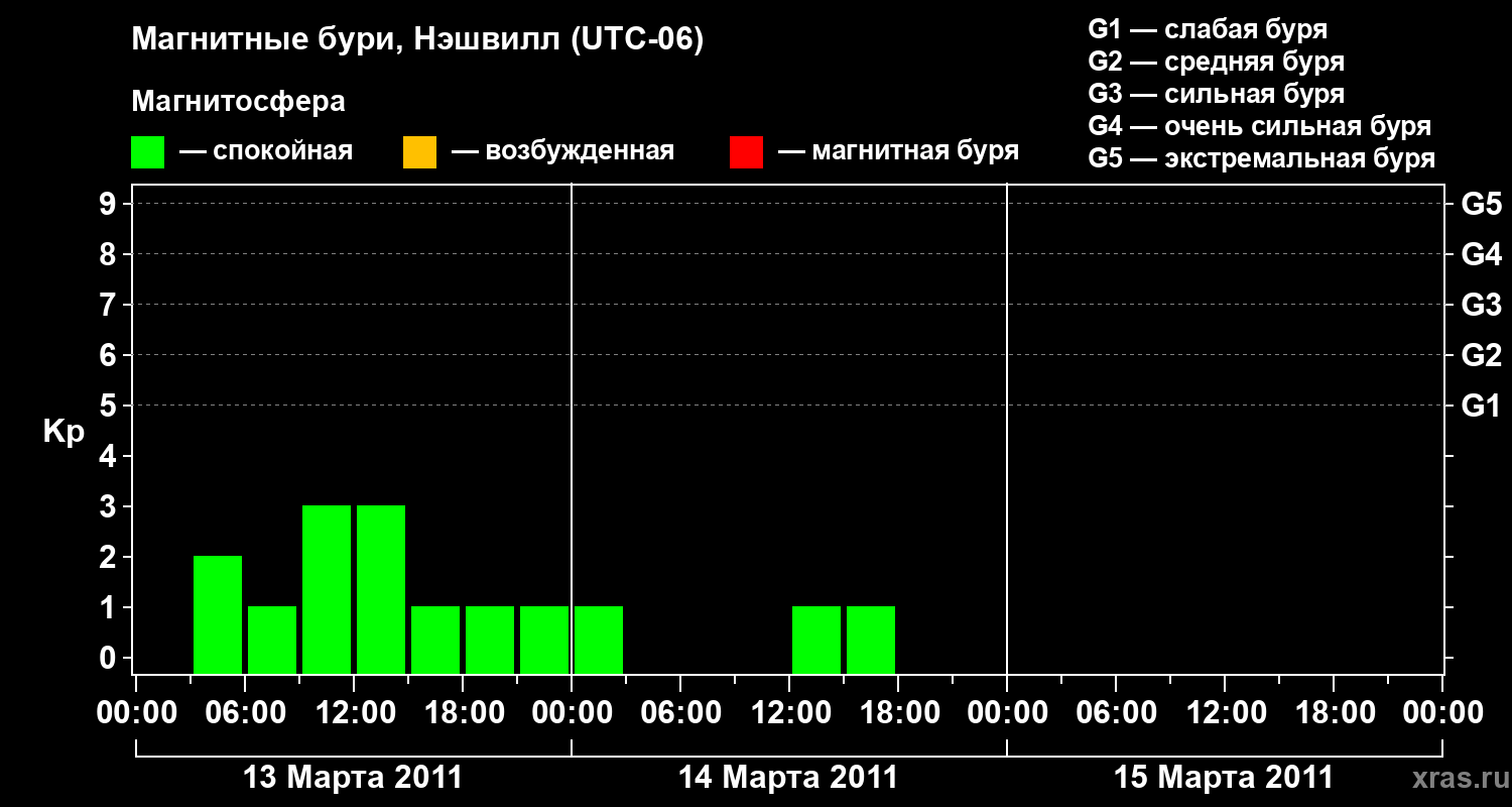Изменения геомагнитного индекса Kp с 13 по 15 марта 2011 года для средних широт