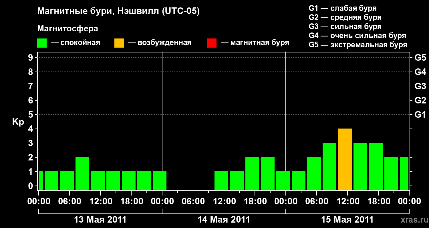 Изменения геомагнитного индекса Kp с 13 по 15 мая 2011 года для средних широт
