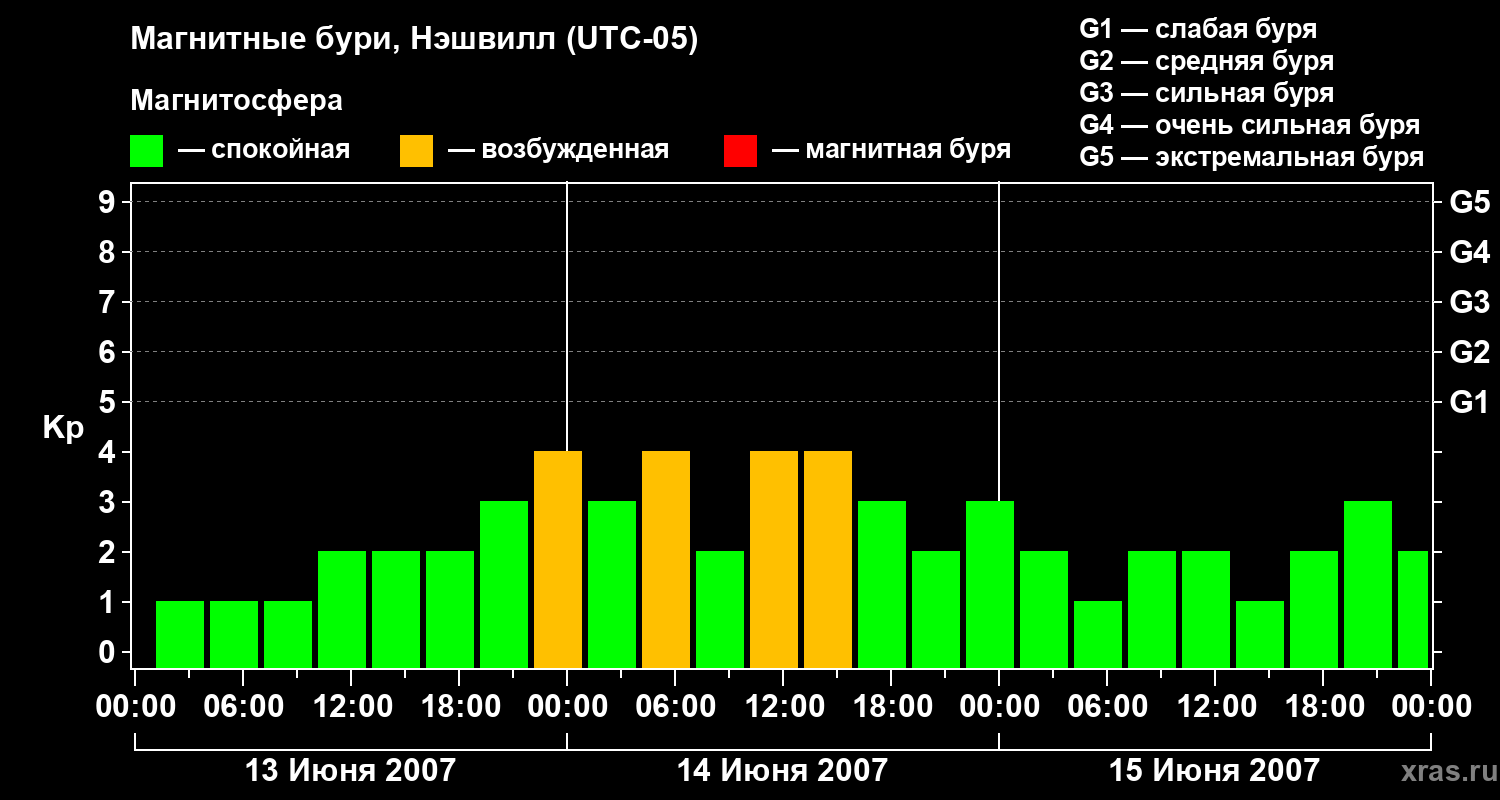 Изменения геомагнитного индекса Kp с 13 по 15 июня 2007 года для средних широт