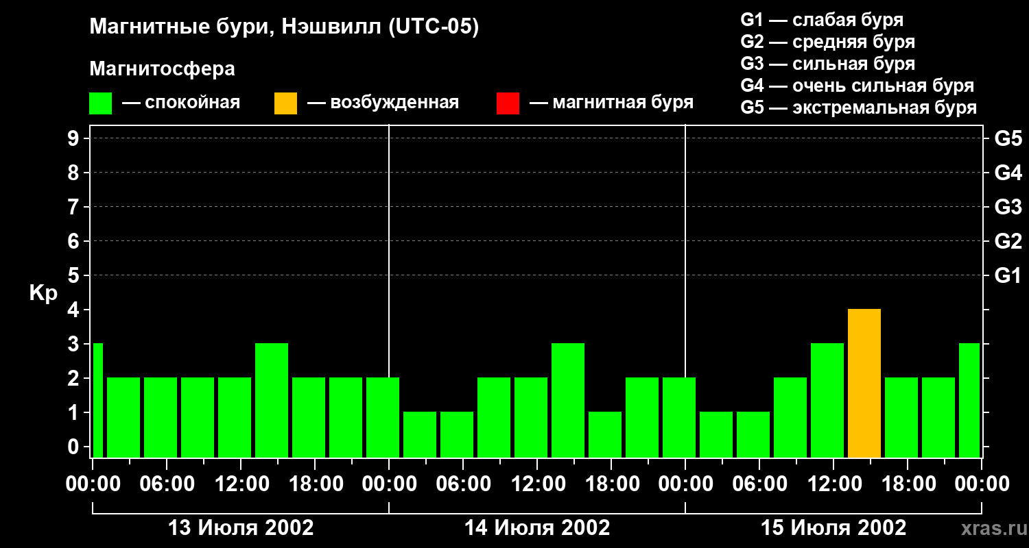 Изменения геомагнитного индекса Kp с 13 по 15 июля 2002 года для средних широт