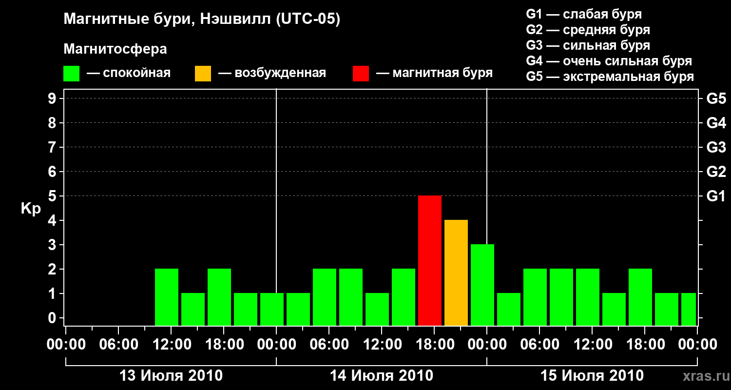 Изменения геомагнитного индекса Kp с 13 по 15 июля 2010 года для средних широт