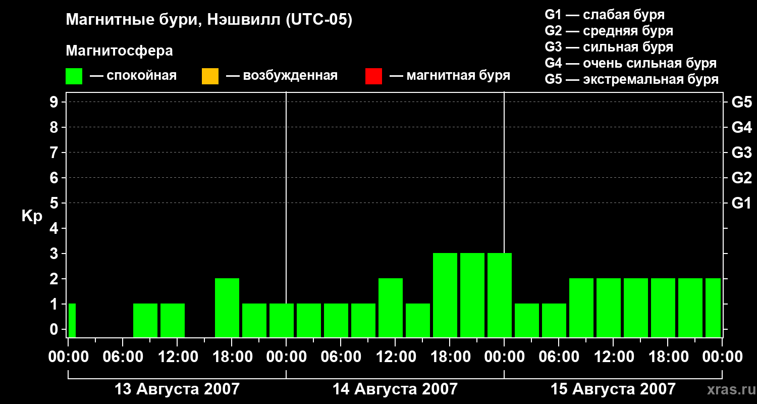 Изменения геомагнитного индекса Kp с 13 по 15 августа 2007 года для средних широт
