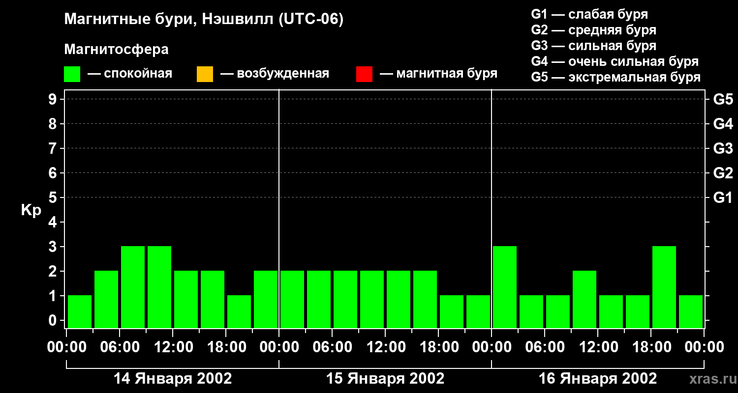 Изменения геомагнитного индекса Kp с 14 по 16 января 2002 года для средних широт