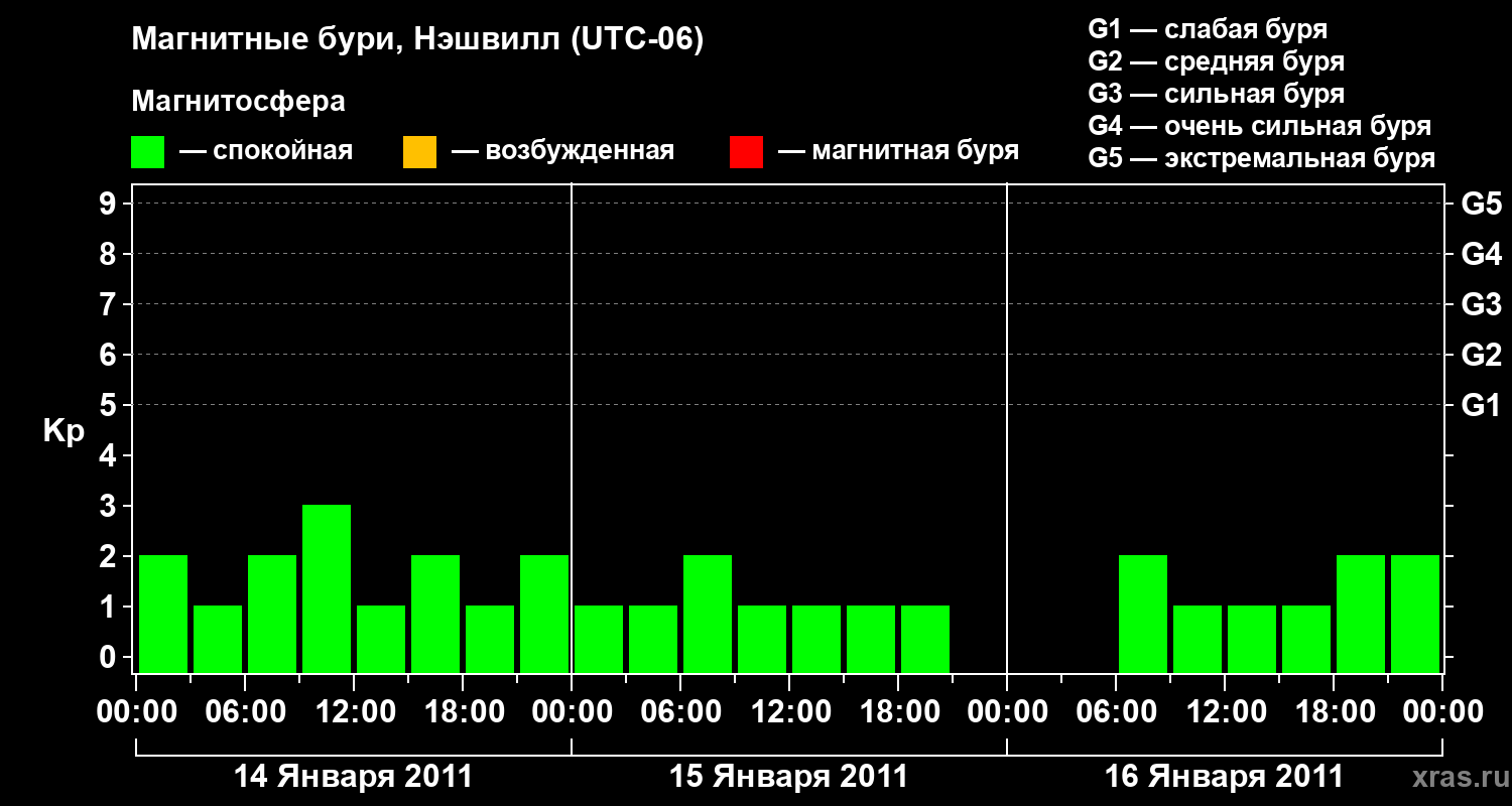 Изменения геомагнитного индекса Kp с 14 по 16 января 2011 года для средних широт